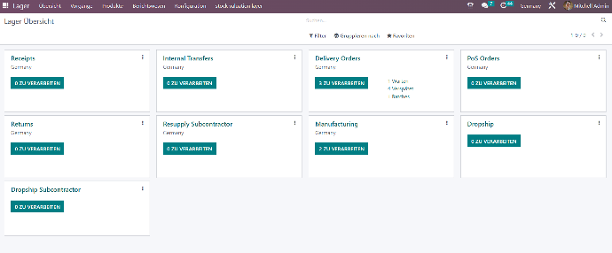 Das Dashboard ist die zentrale Anlaufstelle für alle wichtigen Informationen. Es bietet einen umfassenden Überblick über alle laufenden Lagerprozesse, einschließlich Anlieferungen, Lieferaufträgen, internen Transfers und Fertigungen. Sie können entweder vorgefertigte Vorgangstypen verwenden oder diese individuell an Ihre Bedürfnisse anpassen, um die Prozesse optimal abzubilden. Durch die Anzeige von Verspätungen, Wartelisten und Auftragsrückständen können Sie Verzögerungen schnell erkennen und entsprechend handeln.